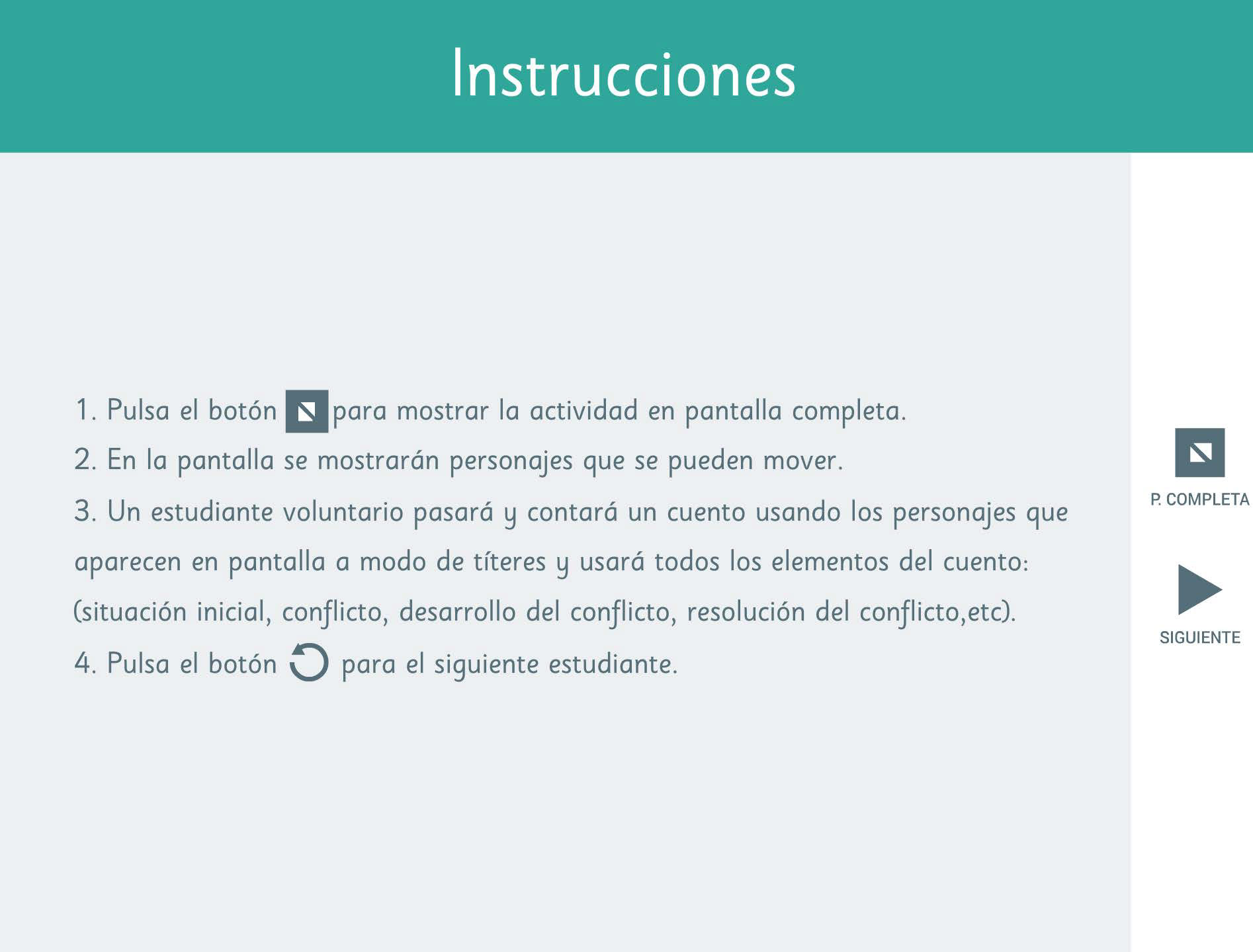 The Activities screen is where you'll experience the full range of what our application has to offer, with a full-screen mode available at the click of a button. You'll also find important information sections that describe the activity, its objectives, and the skills it helps develop.